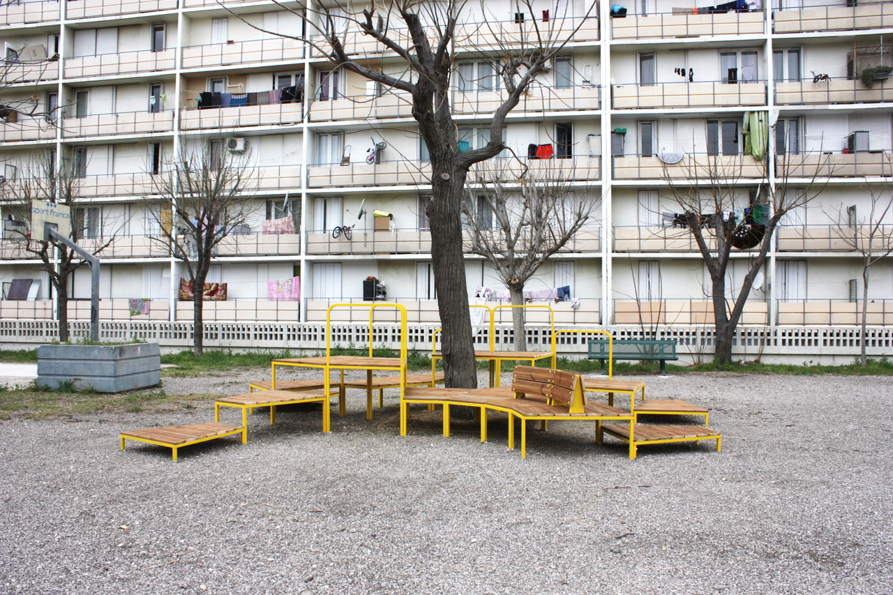 Soucieux de soutenir les diplômés des écoles d’art et d’architecture de Marseille, le Frac Provence-Alpes-Côte d’Azur a fait appel au collectif Les Marsiens. Leur créativité et leurs compétences ont permis de répondre au mieux aux attentes formulées. Un mobilier convivial et modulable a ainsi été réalisé, et il est désormais visible sur la terrasse intérieure du Frac. Bravo pour votre sérieux et votre écoute !
